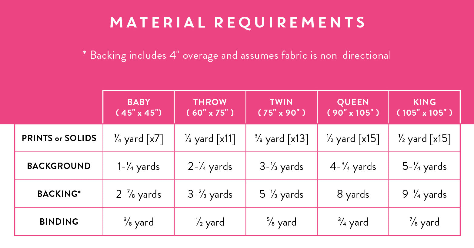 Fabric: Pattern assumes width of fabric is 42" and 1/4" seam allowance. Please note this pattern is not Jelly Roll friendly.