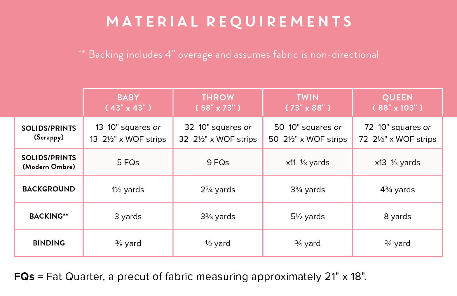 Sizes: Baby (43″ x 43″), Throw (58″ x 73″), Twin (73″ x 88"), and Queen (88″ x 103″).
